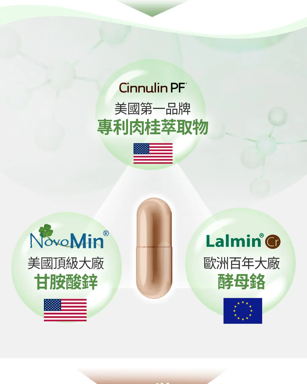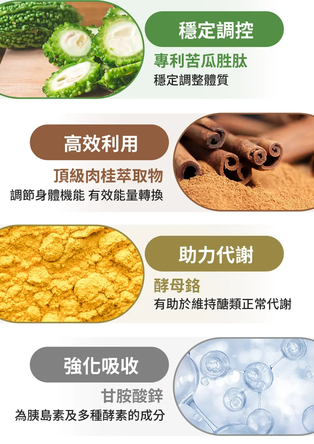 我們選用美國專利【Glycostat 苦瓜胜肽】,榮獲國際頂級科研團隊肯定,並足量添加至 600 mg,遠勝添加不足量的苦瓜胜肽;除此之外,更添加了三大關鍵有感輔助成分,美國頂級【Cinnulin PF肉桂萃取物】、以及加拿大百年大廠【Lalmin天然酵母鉻】,再搭配來自美國【NovoMin®甘胺酸鋅】,成分皆經研究證實,可以幫助確實有感