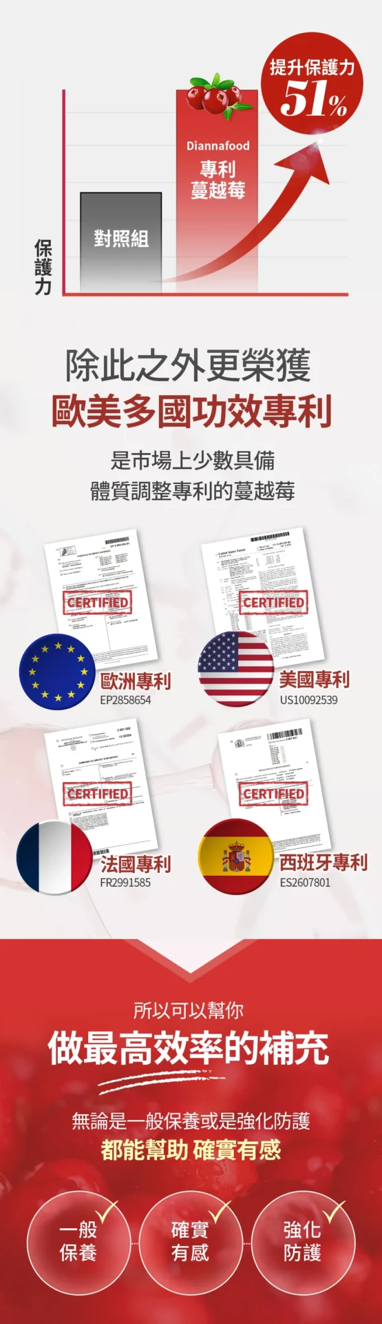 - 選用頂級的蔓越莓:多國功效專利認證