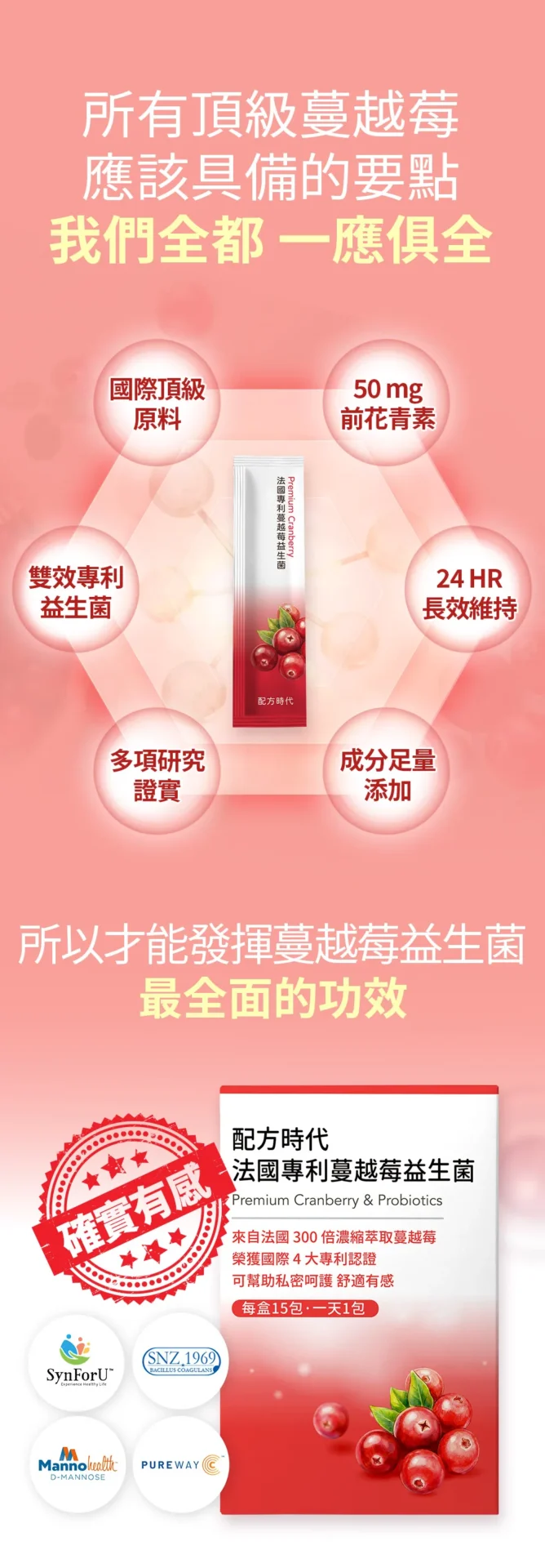 我們的蔓越莓益生菌選用法國頂級【DianaFood 蔓越莓】,以300倍濃縮技術萃取,並榮獲歐美四大功效專利肯定,遠勝其他蔓越莓;除此之外,更添加四大關鍵有感輔助成分,台灣專利SynForU™-HerCare益生菌、日本大廠SNZ 1969®益生菌,以及美國獨家PureWay-C®維生素C,最後再搭配美國專利D-甘露糖,成分皆經研究證實,可以幫助確實有感